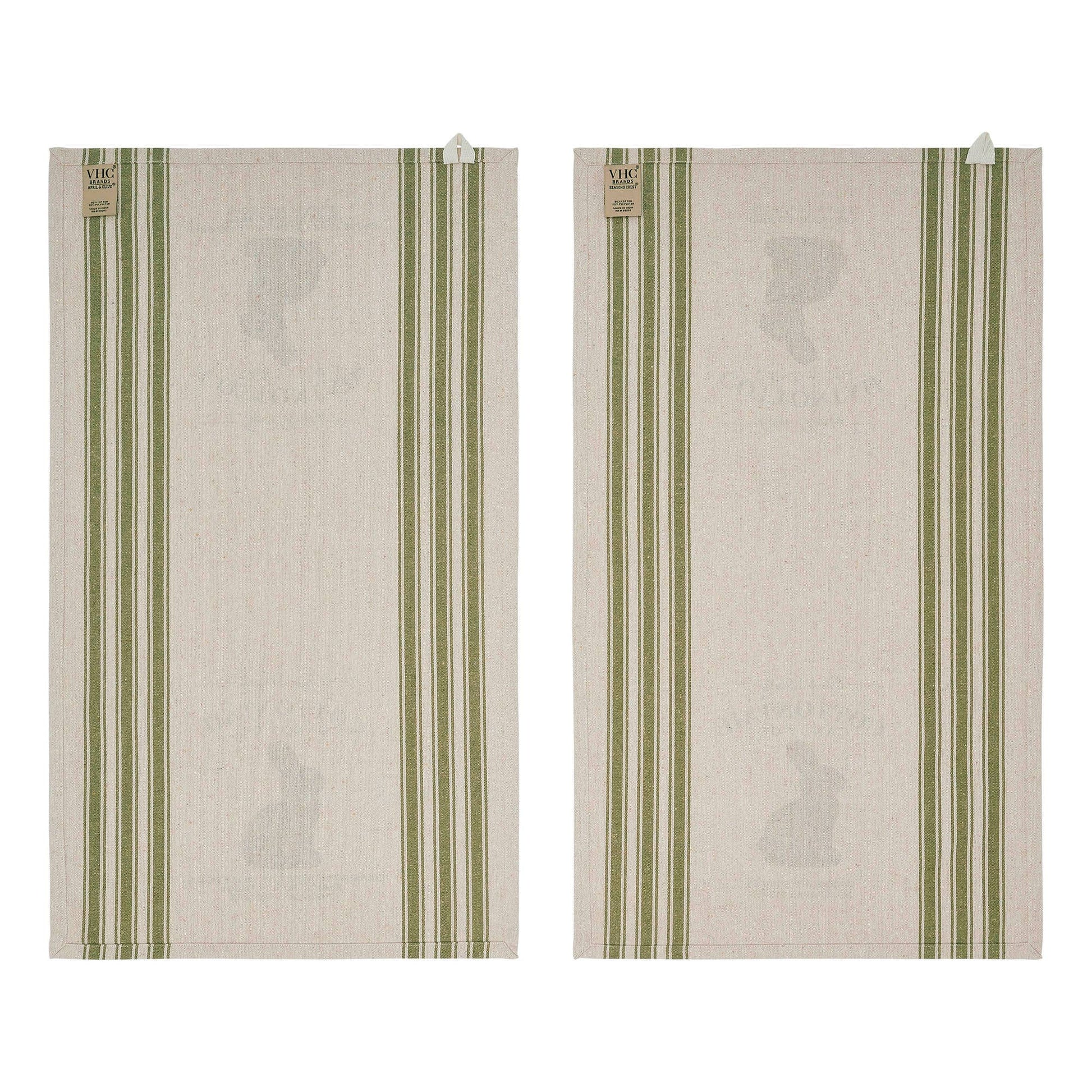 Add a whimsical touch to your kitchen or dining room decor this spring with the VHC Brands Bunny Hop Cottontail Candy Co Tea Towel Set of 2. Each towel measures 16x28 inches and features an adorable vintage-inspired design. A sitting chocolate bunny graphic takes center stage, announcing "Open Daily, Cottontail Candy Co. Marshmallow Chicks + Jelly Beans + Peanut Butter Eggs + Chocolate Bunnies," all set against a light creme backdrop. The playful message is framed with stripes in a subtle sage green, perfectly capturing the essence of a vintage country candy store. These tea towels are crafted from a high-quality blend of cotton and polyester, ensuring durability and softness for daily use.