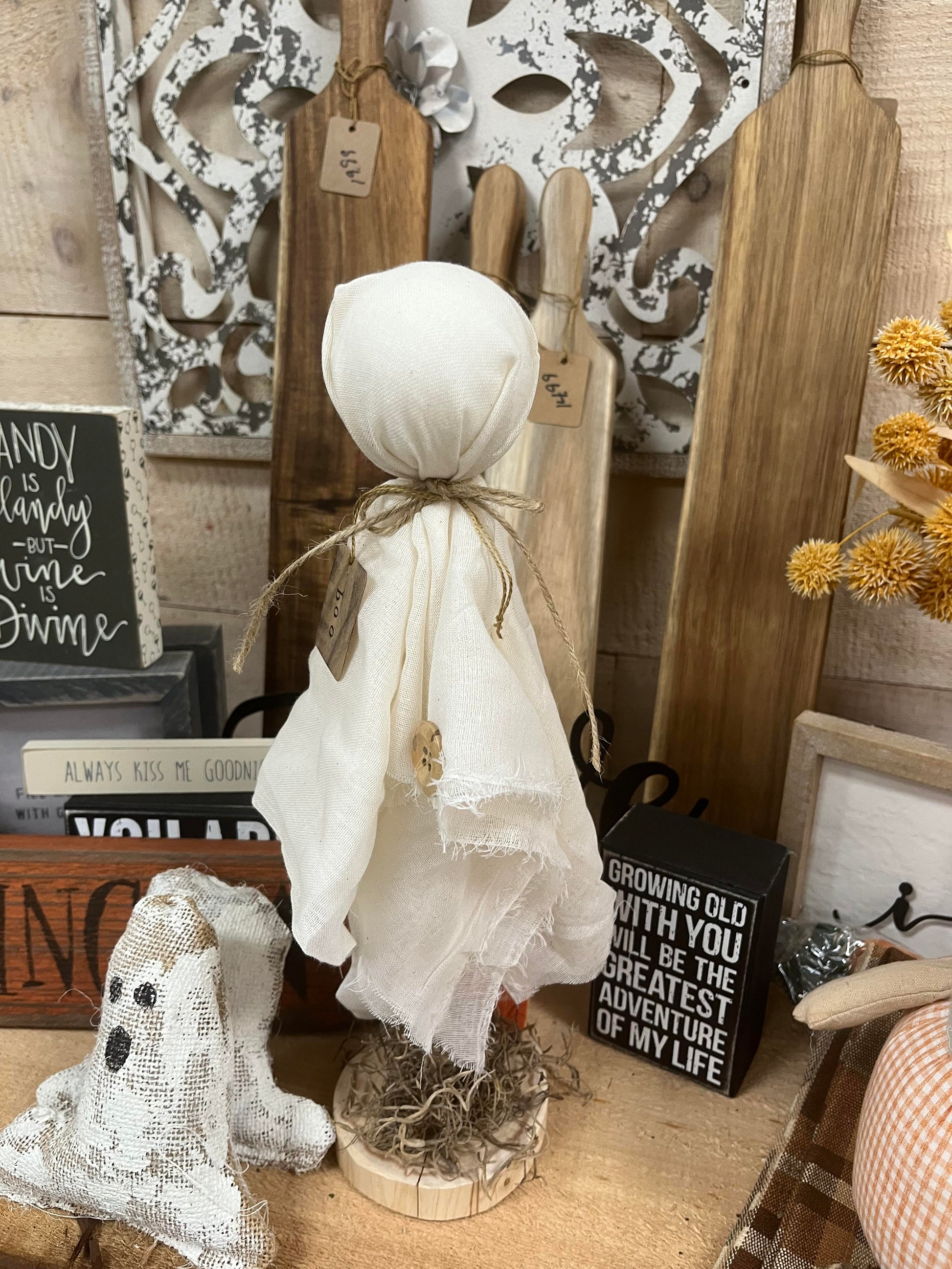 Hand-made ghost on a stand. Nice jute ribbon attached with Primitive Tag.